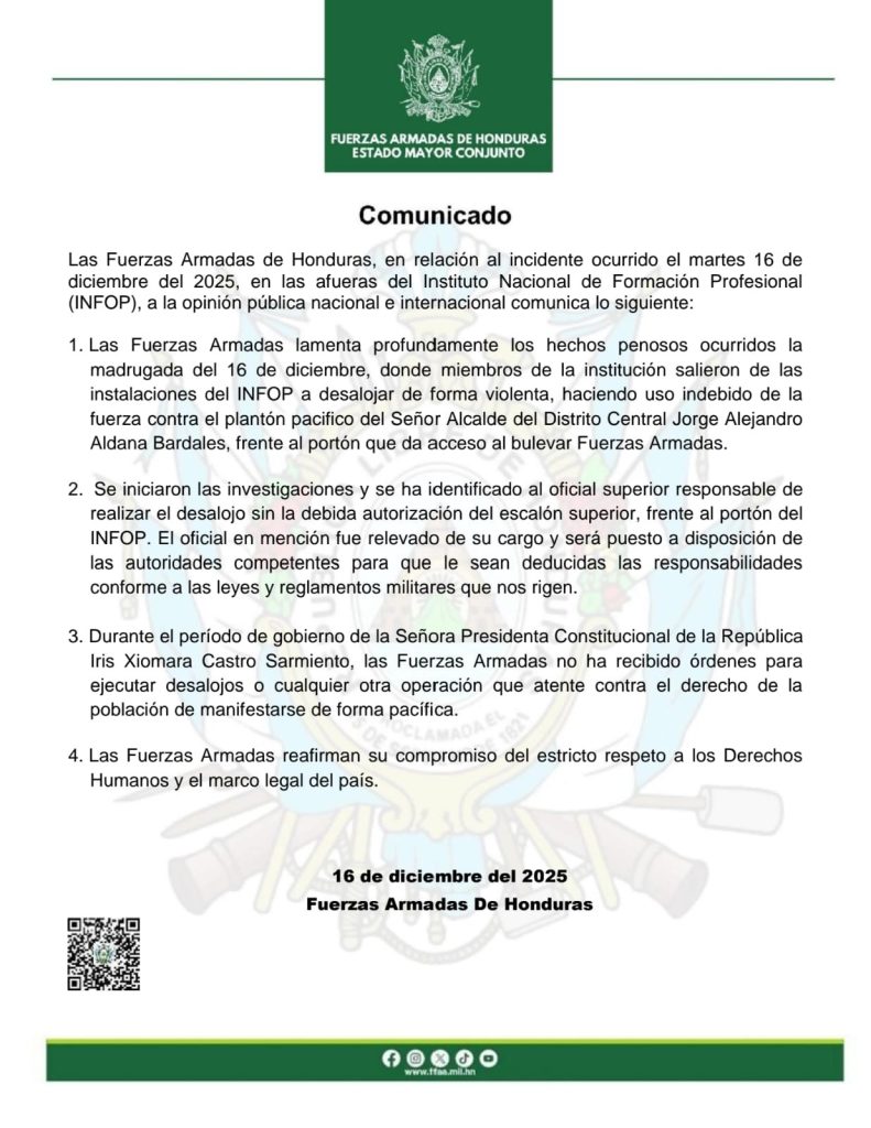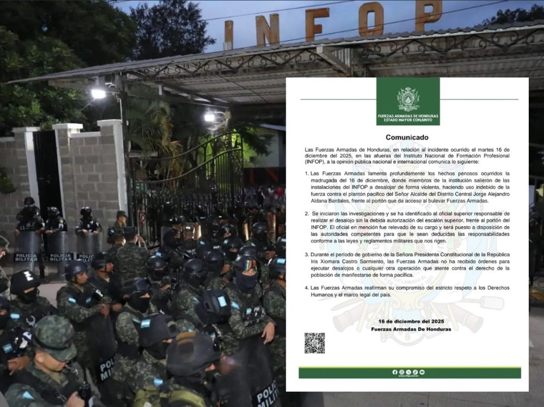 Las Fuerzas Armadas de Honduras (FFAA) informaron este martes la destitución de un oficial superior, a raíz de los desalojos ocurridos durante la madrugada del 16 de diciembre contra colectivos del Partido Libertad y Refundación (Libre), que se mantenían en un plantón frente a las instalaciones del Instituto Nacional de Formación Profesional (Infop), en Tegucigalpa.