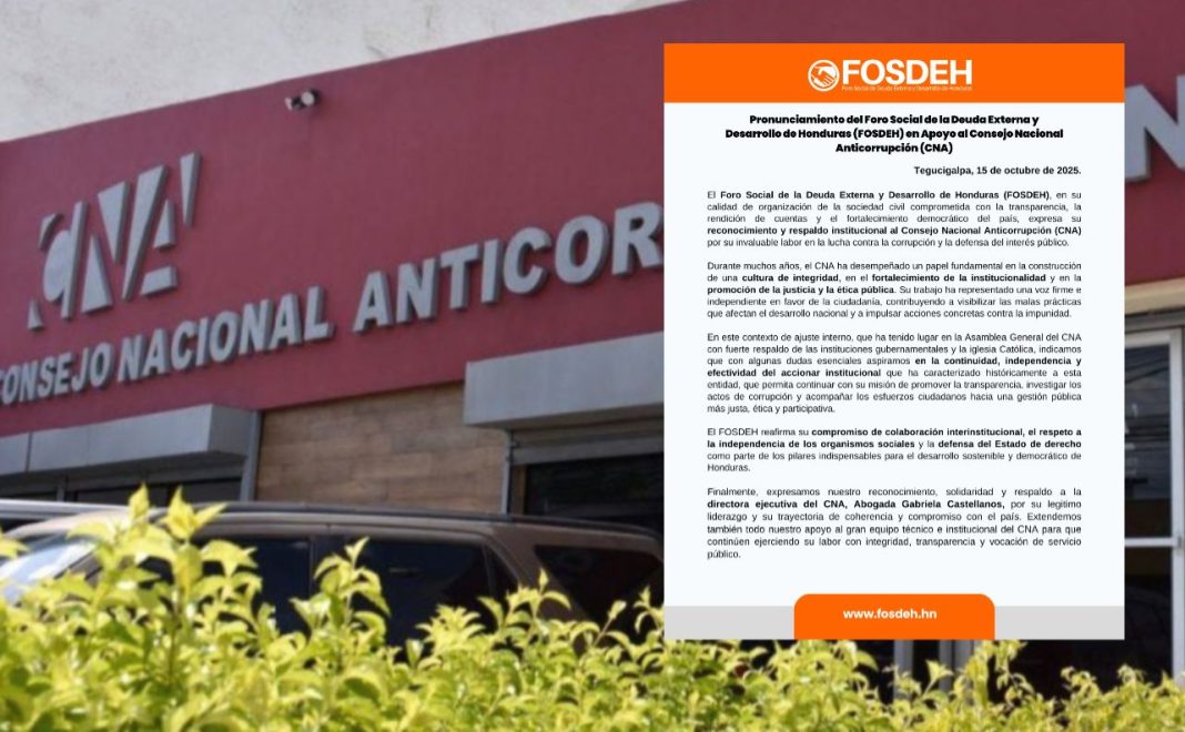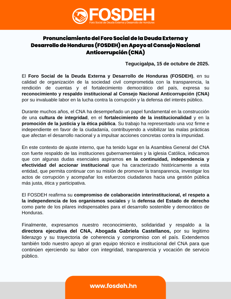 Finalmente, el FOSDEH exhortó a que el CNA mantenga su papel de voz independiente en la defensa del interés público y la lucha contra la impunidad, reiterando su apoyo al equipo técnico e institucional del organismo para que continúe ejerciendo su labor con integridad, transparencia y vocación de servicio público.