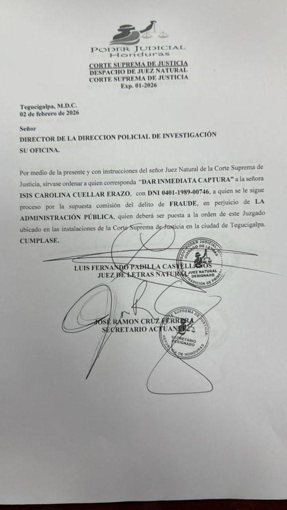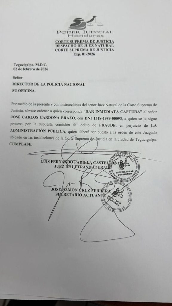 El documento oficial emitido por el máximo tribunal del país instruye: “Por medio de la presente y con instrucciones del señor Juez Natural de la Corte Suprema de Justicia, sírvase ordenar a quien corresponda dar inmediata captura al señor José Carlos Cardona Erazo”.