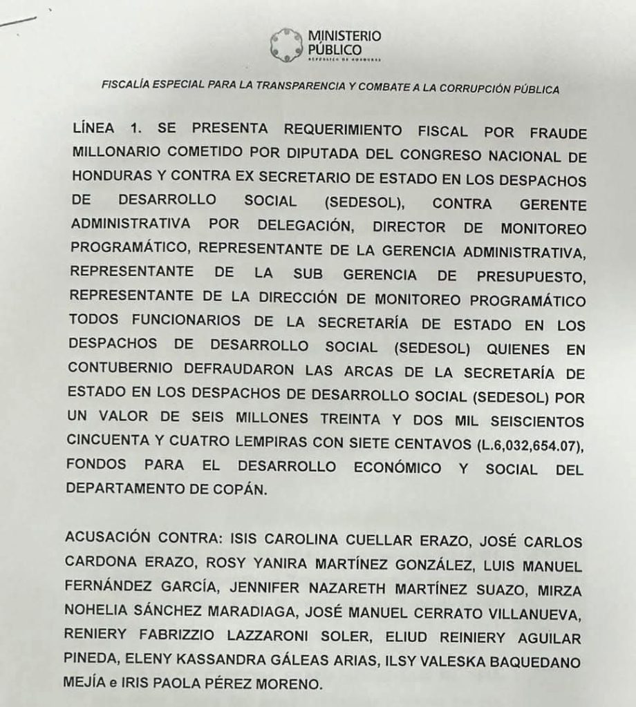 La Fiscalía Especial para la Transparencia y Combate a la Corrupción Pública (Fetccop) presentó este lunes 2 de febrero un requerimiento fiscal contra la diputada del Partido Libertad y Refundación (Libre), Isis Cuéllar, y el exsecretario de Estado en los Despachos de Desarrollo Social (Sedesol), José Carlos Cardona, acusados de su participación en un presunto esquema de fraude millonario en perjuicio del Estado.
