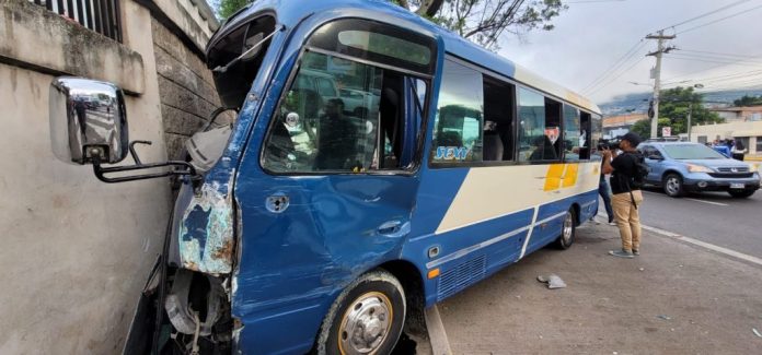 Un fuerte accidente vial se suscitó a tempranas horas de este miércoles luego que un bus ejecutivo mejor conocido como ‘rapidito’ de la ruta Carrizal- Miraflores impactó contra un muro del Hospital Escuela, por ir peleando línea en el bulevar Suyapa, de Tegucigalpa.