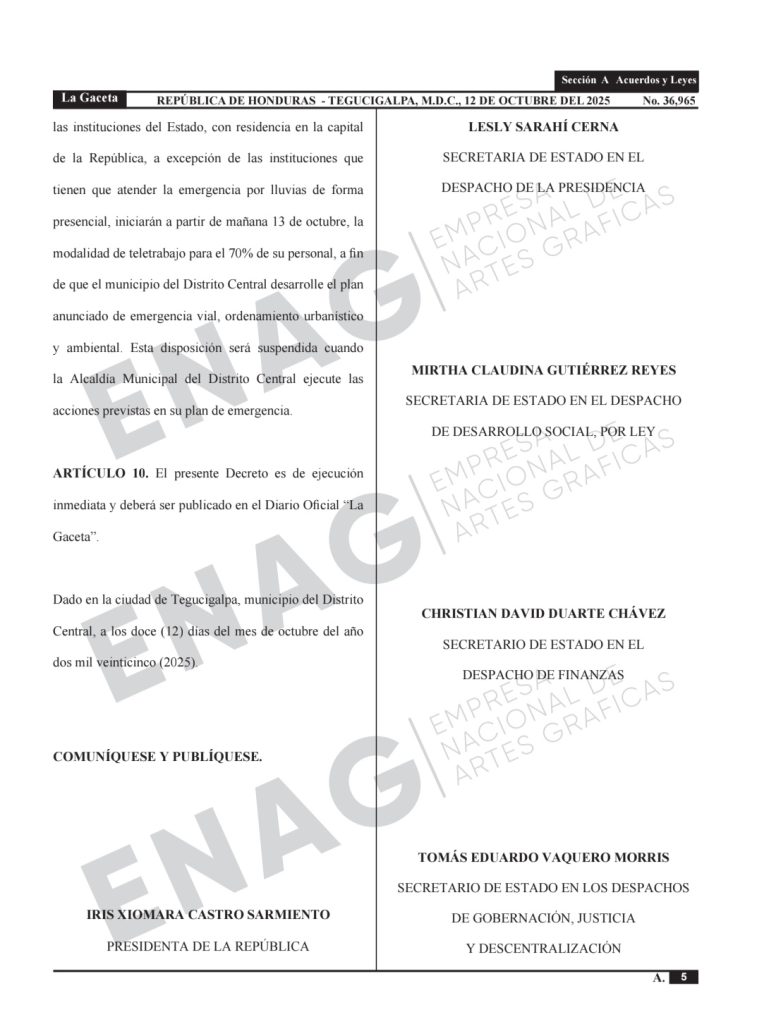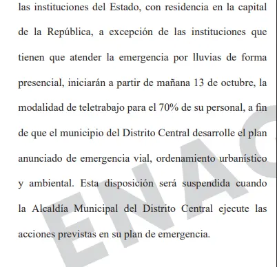 Entre las disposiciones, el decreto establece que el 70% del personal estatal en Tegucigalpa deberá trabajar de forma remota, mientras se implementa un plan de emergencia vial en el Distrito Central, una medida que permanecerá vigente hasta que la Alcaldía capitalina ejecute las obras necesarias.