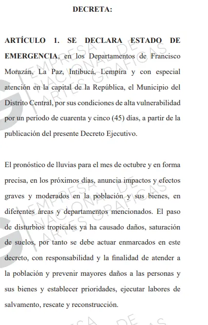 A través de una publicación en el Diario Oficial La Gaceta, el Gobierno de la República oficializó un nuevo estado de emergencia por 45 días en los departamentos de Francisco Morazán, La Paz, Intibucá y Lempira, con especial atención en el Municipio del Distrito Central, debido a las condiciones de alta vulnerabilidad provocadas por las lluvias que afectan gran parte del país.
