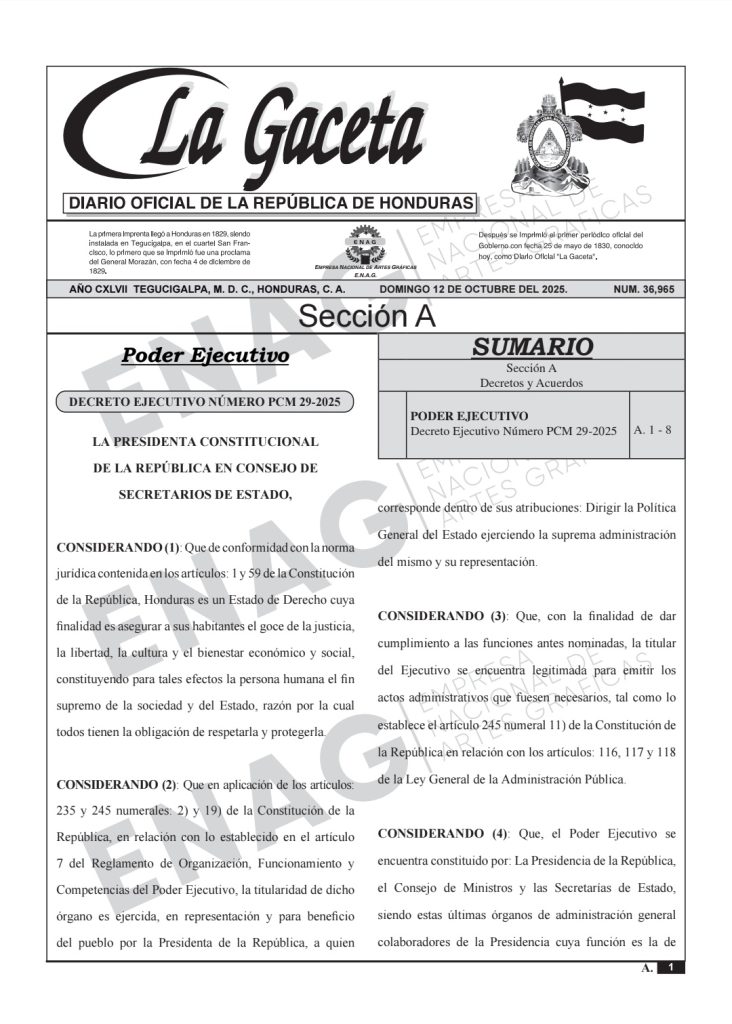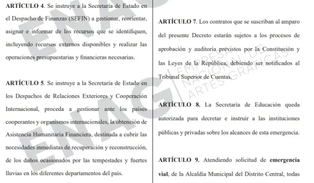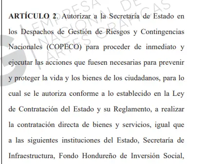 El decreto ejecutivo autoriza a la Secretaría de Gestión de Riesgos y Contingencias Nacionales (Copeco) y a otras instituciones estatales a realizar compras directas de bienes y servicios, sin necesidad de procesos de licitación, bajo el argumento de que estas medidas son necesarias para prevenir daños mayores y responder de forma inmediata ante la temporada ciclónica.