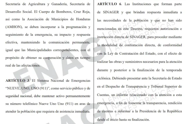 Además, se otorgan facultades extraordinarias al Sistema Nacional de Gestión de Riesgos (Sinager), integrado por instituciones como la Policía Nacional, las Fuerzas Armadas, la Secretaría de Agricultura y Ganadería (SAG) y el Sistema Nacional de Emergencia 911, para ejecutar obras, adquirir suministros y contratar servicios por vía directa.