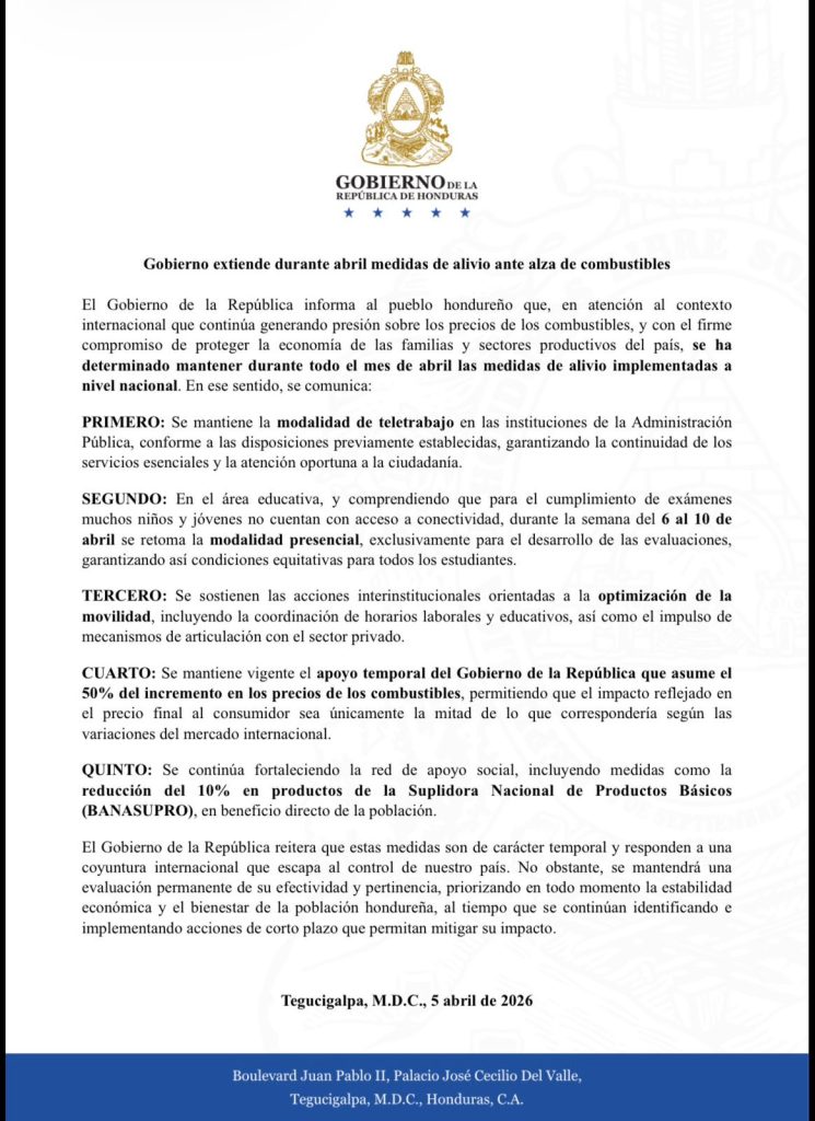 El Gobierno de la República de Honduras anunció la noche de este domingo la extensión de la modalidad de teletrabajo durante todo el mes de abril para los empleados de la administración pública, como parte de un paquete de medidas orientadas a mitigar el impacto del alza internacional de los combustibles.