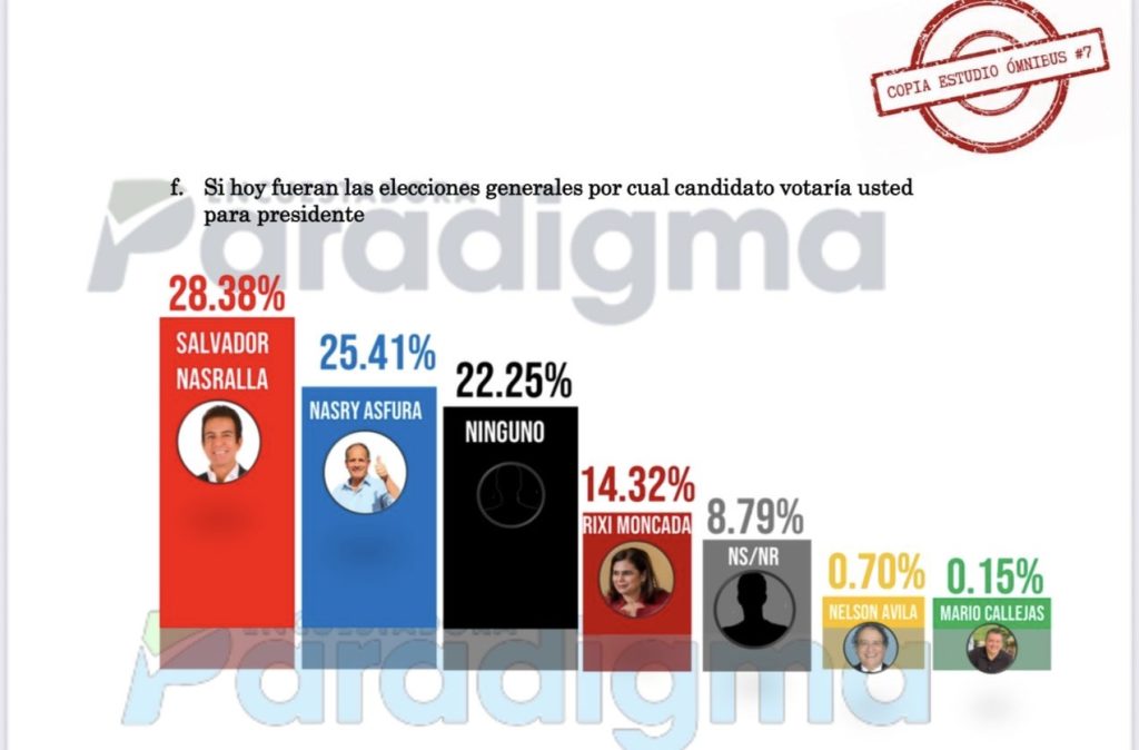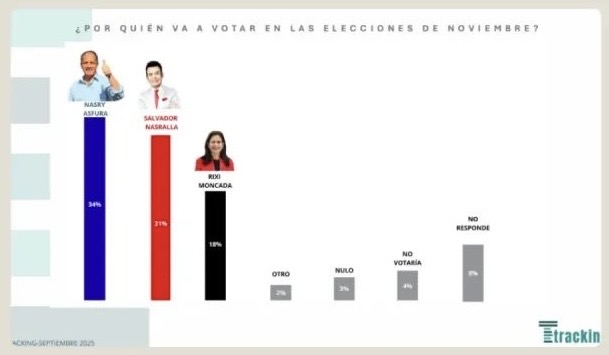 Por su parte, la encuestadora Paradigma, en su estudio Ómnibus #9 realizado en septiembre, también coloca a Nasralla en primer lugar con 28.38%, seguido de Asfura con 25.41% y más atrás Moncada con 14.32%.