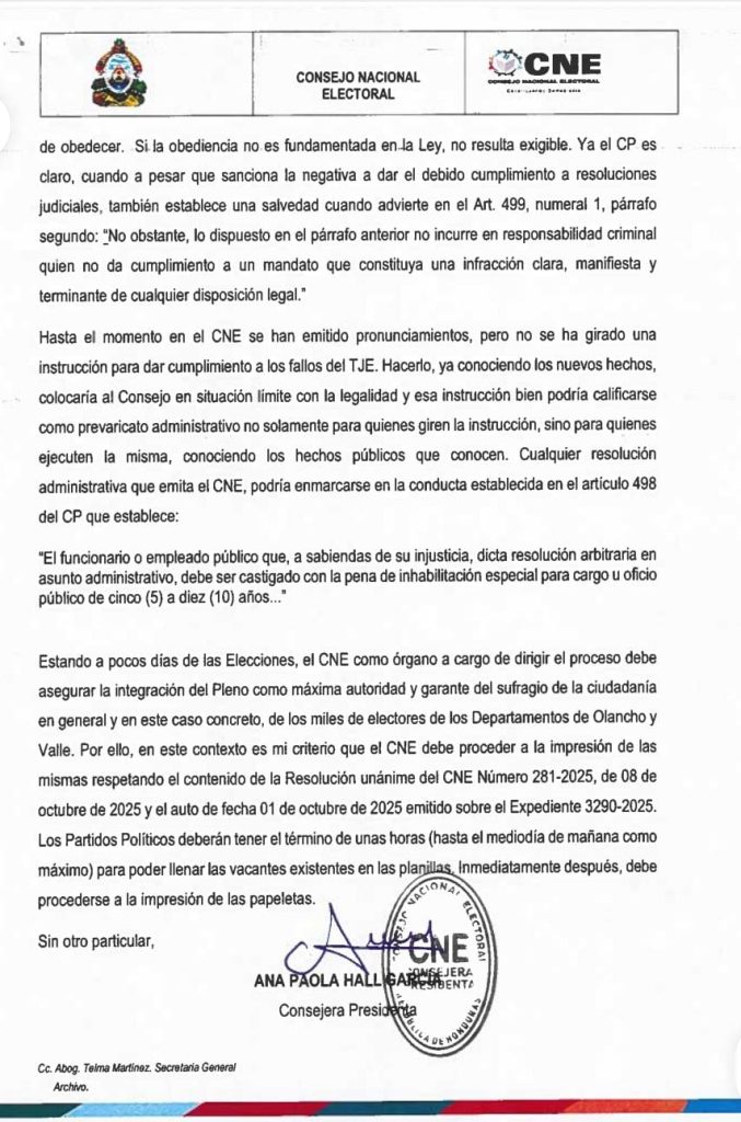 La presidenta del Consejo Nacional Electoral (CNE), Ana Paola Hall, instruyó avanzar con la impresión de las papeletas electorales de diputados en los departamentos de Olancho y Valle, pese a los recientes fallos del Tribunal de Justicia Electoral (TJE) que ordenaban la inscripción de Jorge Cálix y Cristian Villalobos como candidatos a diputados.