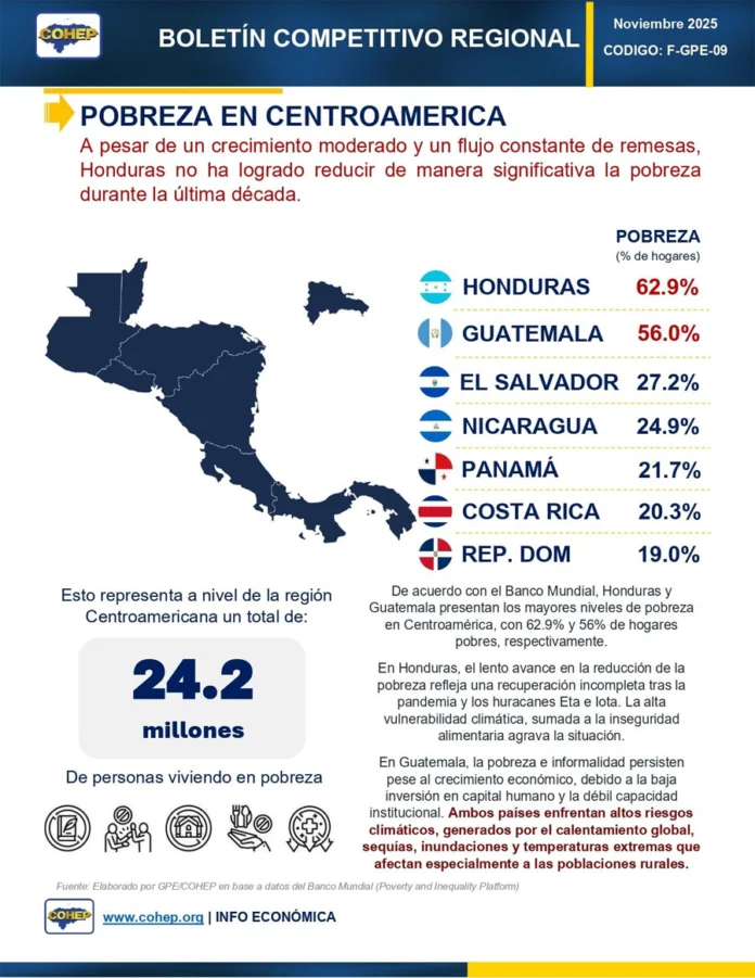 Según el análisis, Honduras lidera en Centroamérica como la nación con mayor nivel de pobreza, con un 62.9 % de su población en esa condición, seguida de Guatemala con 56.0%.