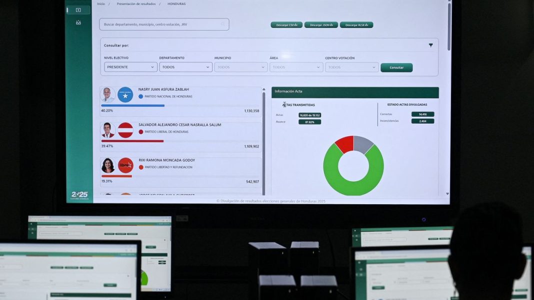 Según los resultados preliminares del ente electoral, Nasry ‘Tito’ Asfura, del Partido Nacional, a quien apoya el presidente de Estados Unidos, Donald Trump, encabeza la votación con el 40,54 % de los sufragios, seguido por Salvador Nasralla, del Partido Liberal, ambos conservadores, con el 39,19 %, mientras que la candidata del partido Libre, Rixi Moncada, se ubica en tercer lugar con el 19,29 %, con el 99,80 % de las actas electorales escrutadas.