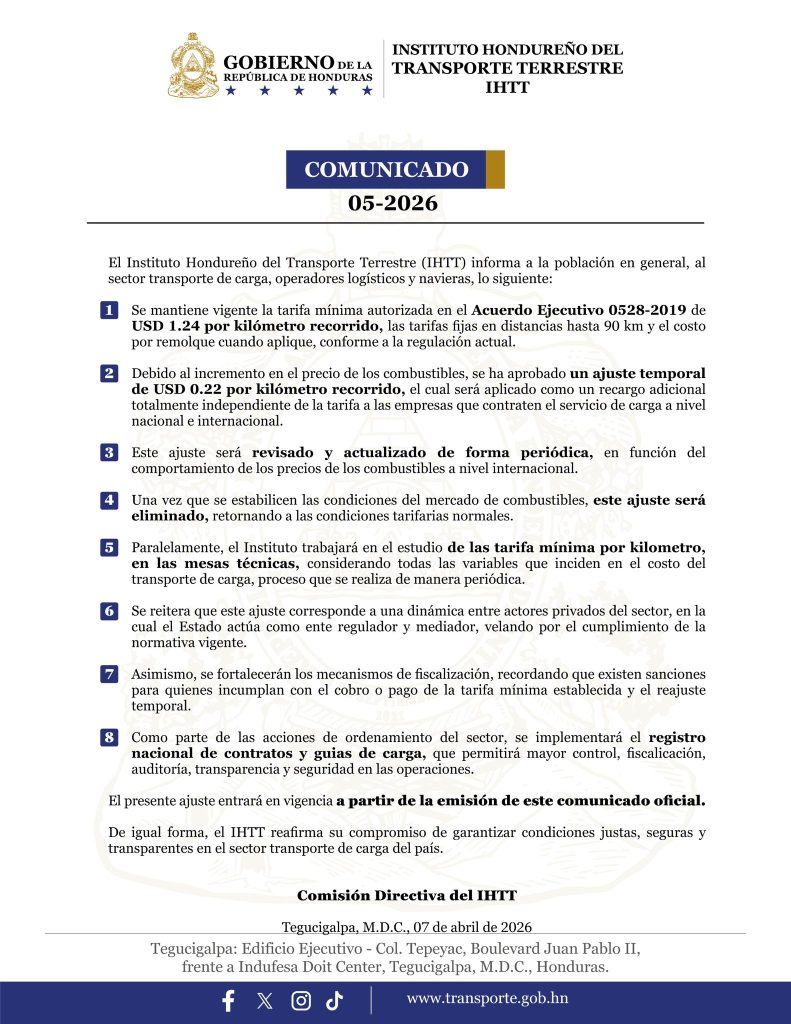 Con esta medida, el IHTT reafirma su compromiso de garantizar condiciones justas, seguras y transparentes en el transporte de carga, en un contexto marcado por el encarecimiento de los combustibles a nivel internacional.