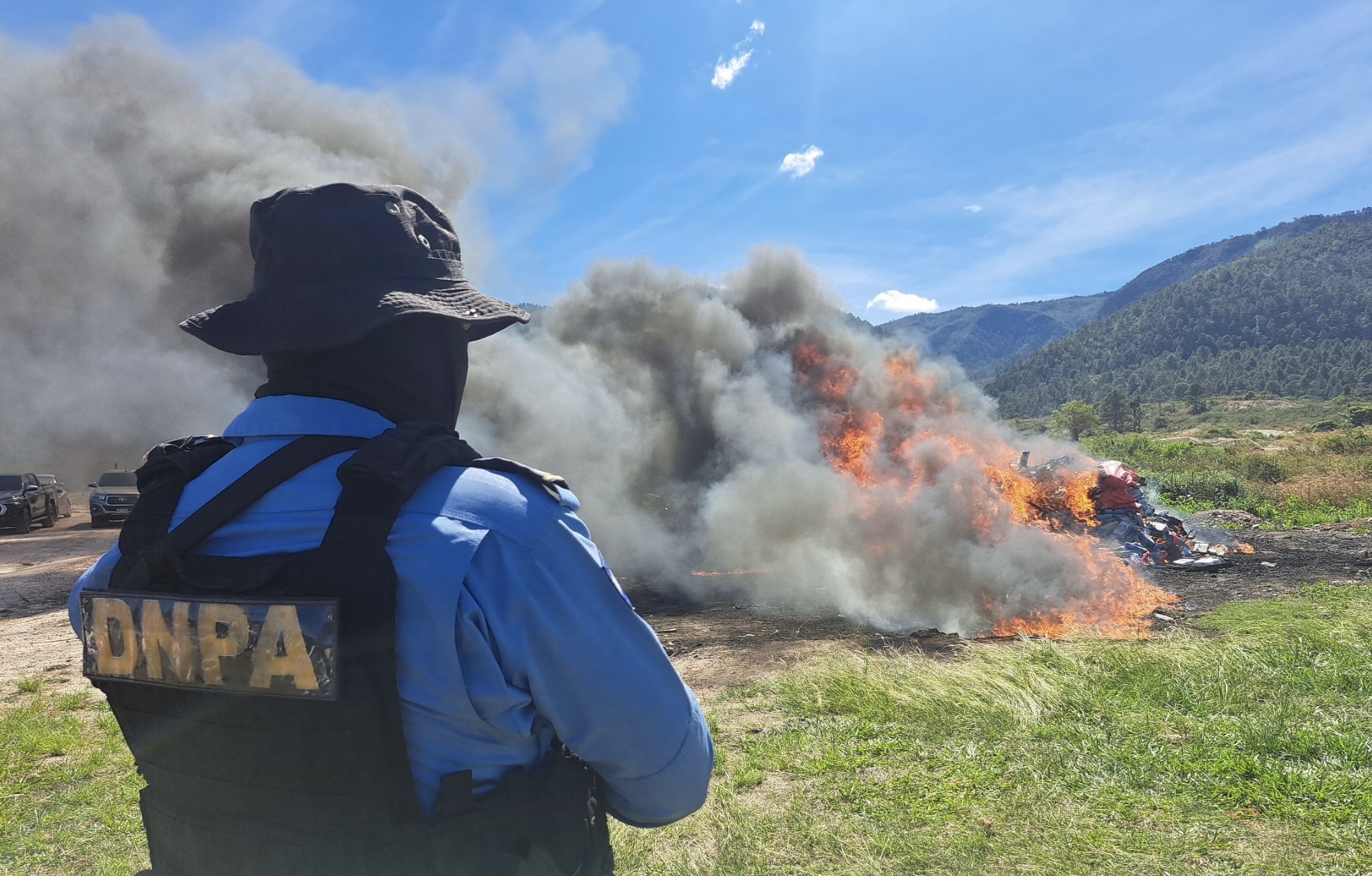 Otro de los cargamentos a incinerar son 472 kilos decomisados el 6 de noviembre en un sector de Cofradía, Cortés, al requerir a Donaldo Mejía Lemus, conductor de un vehículo marca Isuzu, color blanco con registro número HCU 8142, encontrando en la parte trasera 16 sacos con paquetes de la droga.