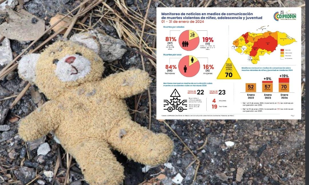 De acuerdo con las estadísticas de la Coordinación de Instituciones Privadas por las Niñas, Niños, Adolescentes, Jóvenes y sus Derechos (Coiproden), las muertes violentas de niños, adolescentes y jóvenes en Honduras aumentó un 19 % en enero de 2024.