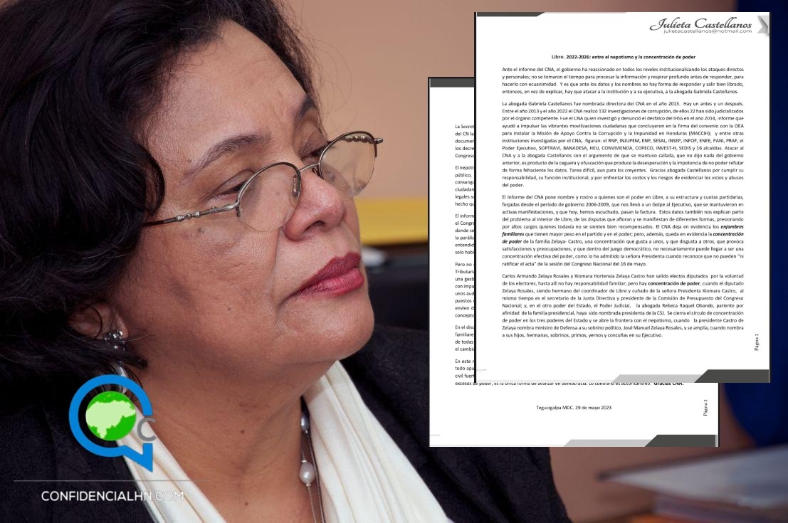 Luego del informe divulgado la semana pasada por el Consejo Nacional Anticorrupción (CNA), en el que denuncia “nepotismo” en el gobierno de Xiomara Castro, la socióloga y exrectora de la Universidad Nacional Autónoma de Honduras (UNAH), publica una carta abierta denominada: «Libre. 2022-2026: entre el nepotismo y la concentración de poder”