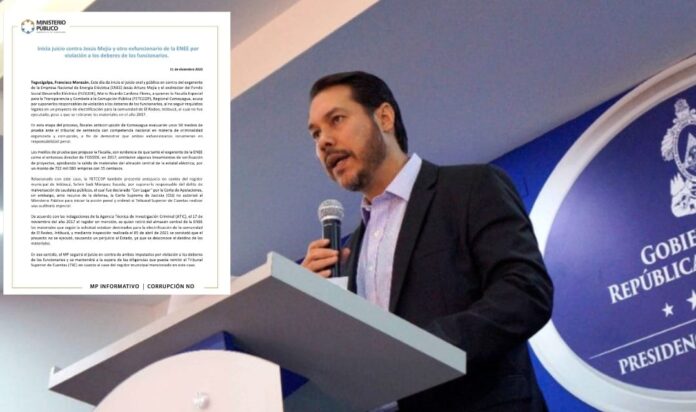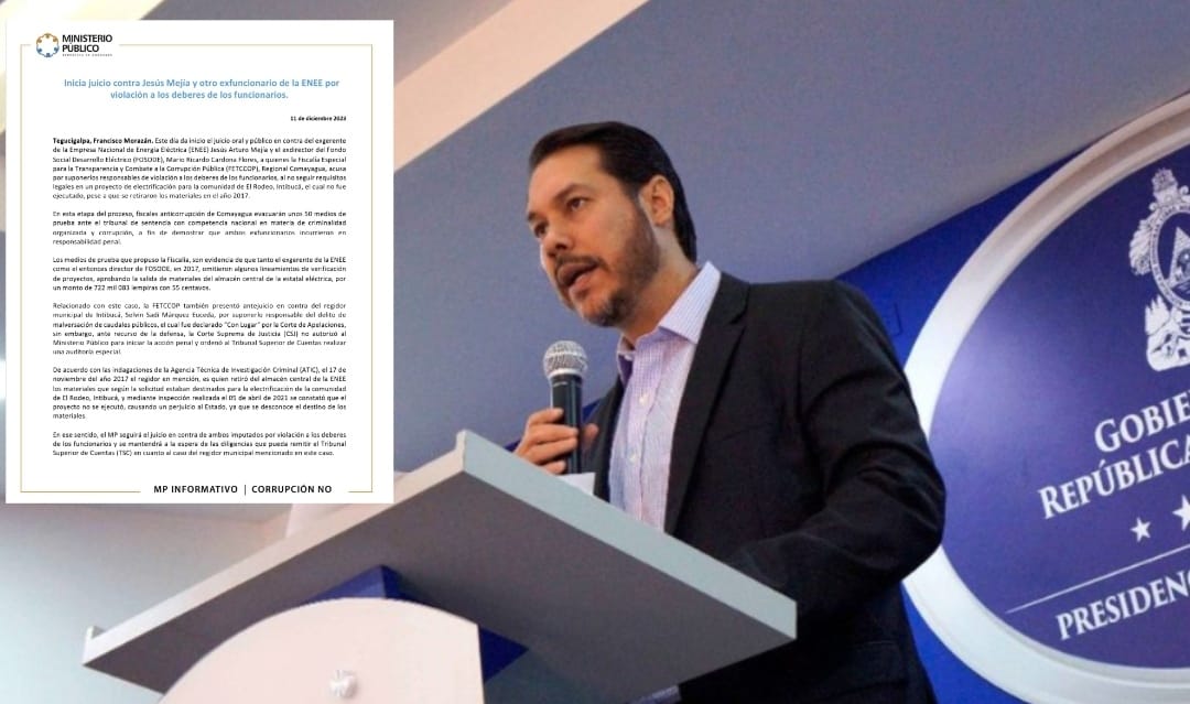 Este día da inicio el juicio oral y público en contra del exgerente de la Empresa Nacional de Energía Eléctrica (ENEE) Jesús Arturo Mejía y el exdirector del Fondo Social Desarrollo Eléctrico (FOSODE), Mario Ricardo Cardona Flores, a quienes la Fiscalía Especial para la Transparencia y Combate a la Corrupción Pública (FETCCOP), Regional Comayagua, acusa por suponerlos responsables de violación a los deberes de los funcionarios, al no seguir requisitos legales en un proyecto de electrificación para la comunidad de El Rodeo, Intibucá, el cual no fue ejecutado, pese a que se retiraron los materiales en el año 2017.