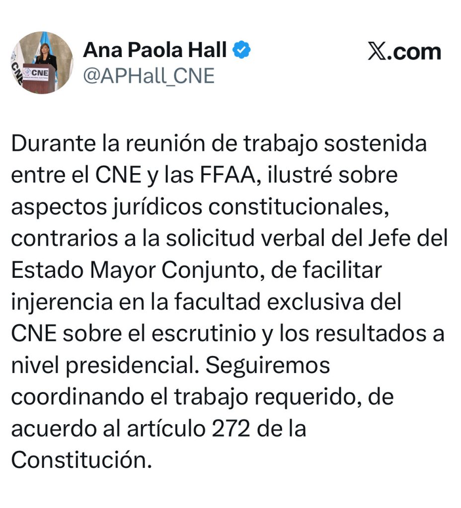 “Durante la reunión de trabajo sostenida entre el CNE y las FF.AA., ilustré sobre aspectos jurídicos constitucionales contrarios a la solicitud verbal del jefe del Estado Mayor Conjunto, de facilitar injerencia en la facultad exclusiva del CNE sobre el escrutinio y los resultados a nivel presidencial. Seguiremos coordinando el trabajo requerido, de acuerdo al artículo 272 de la Constitución”, escribió Hall en su cuenta de X.