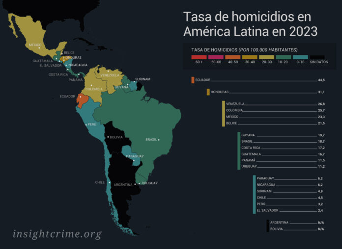 No resulta sorprendente que México, hogar de notorios grupos criminales que compiten por el control del tráfico de fentanilo y de personas, tuviera una tasa de homicidios relativamente alta de 23,3.