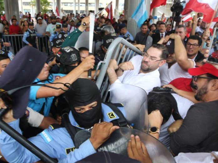 Los disturbios ocurrieron cuando diputados y simpatizantes del Partido Liberal se manifestaban exigiendo garantías para las elecciones del 30 de noviembre, en medio de gritos de “¡Fuera el familión!” en alusión a la familia Zelaya, a quienes acusan de querer perpetuarse en el poder.