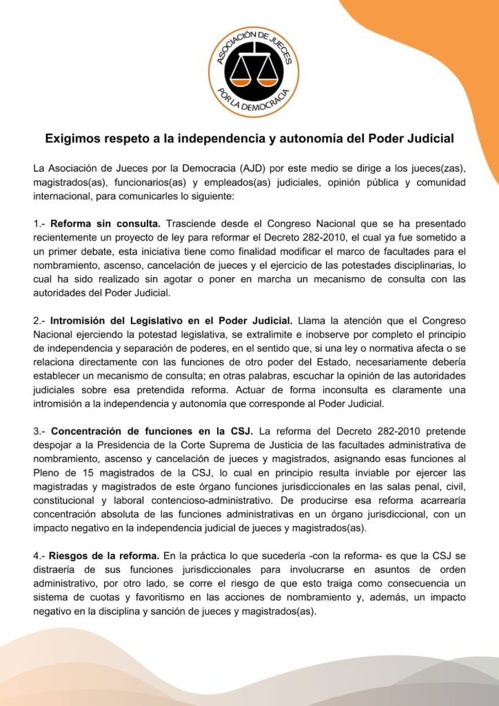 La organización emitió un pronunciamiento en reacción al proyecto que propone reformar el decreto 282-2010, el cual trasladaría dichas atribuciones administrativas al pleno de los 15 magistrados de la CSJ.