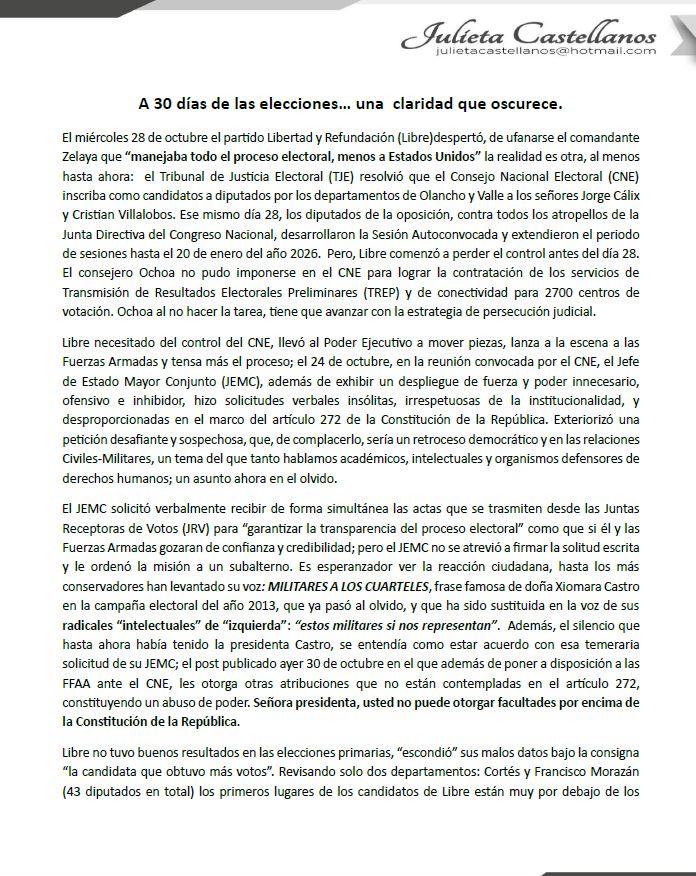 En su análisis titulado “A 30 días de las elecciones… una claridad que oscurece”, Castellanos sostiene que los últimos acontecimientos reflejan una pérdida de control político del oficialismo. Menciona entre ellos la resolución del Tribunal de Justicia Electoral (TJE) a favor de los diputados Jorge Cálix y Cristian Villalobos, la falta de contratación del sistema de Transmisión de Resultados Electorales Preliminares (TREP), y las crecientes tensiones entre el Consejo Nacional Electoral (CNE) y las Fuerzas Armadas (FF. AA.).