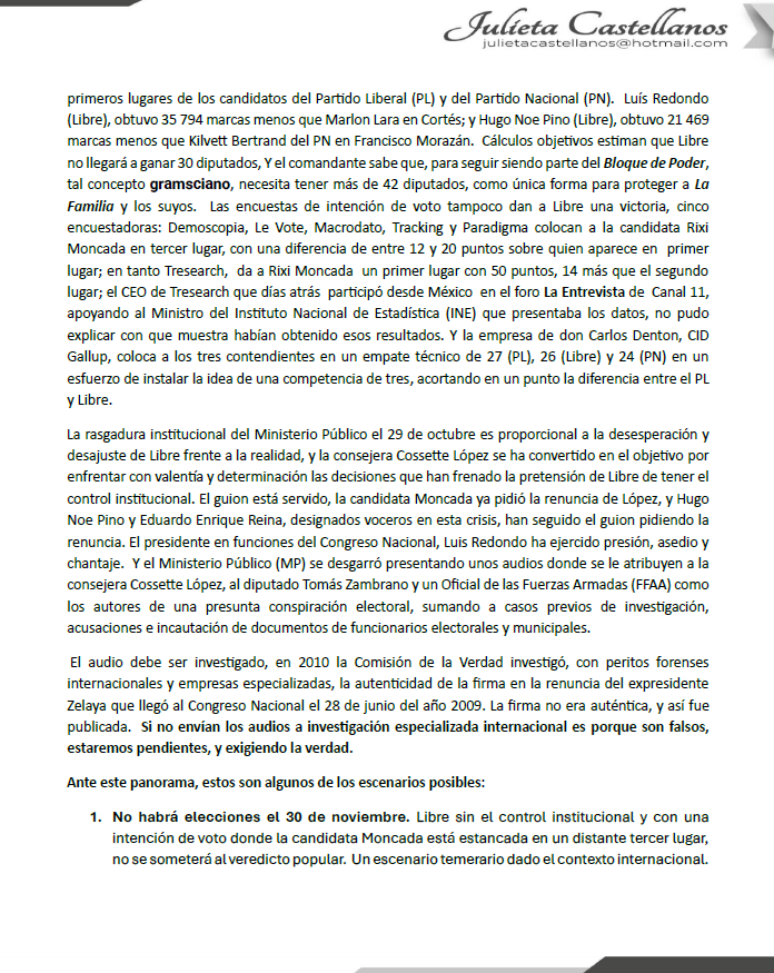 “Cálculos objetivos estiman que Libre no llegará a ganar 30 diputados, y Zelaya sabe que para seguir siendo parte del bloque de poder necesita al menos 42”, afirmó, citando el concepto gramsciano del control institucional.