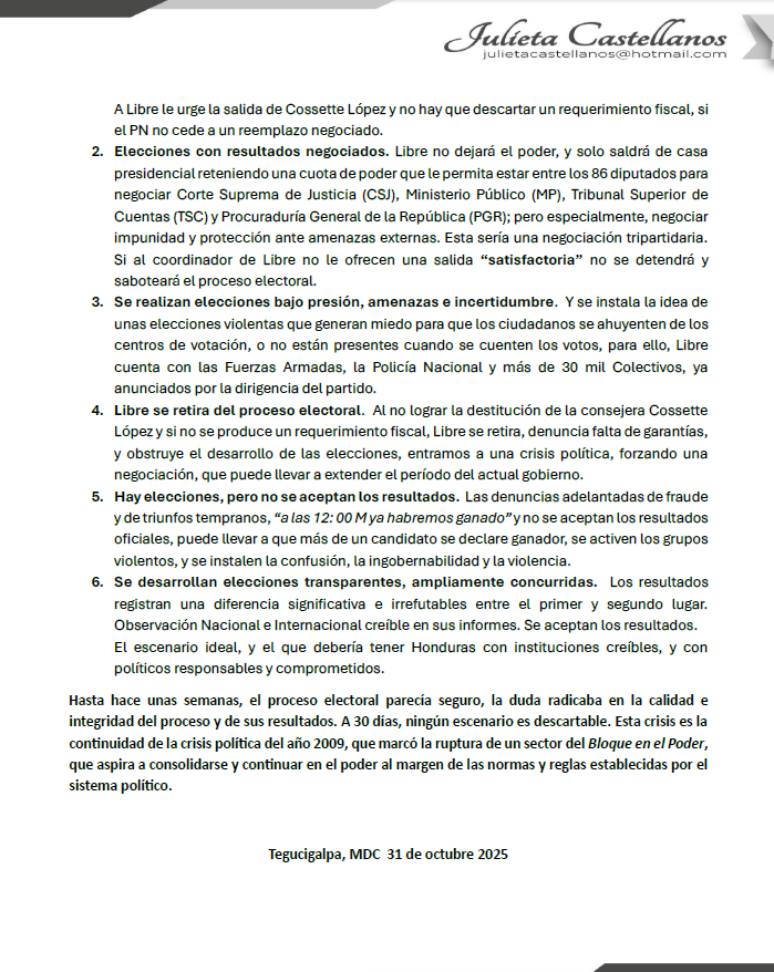 “Hasta hace unas semanas el proceso parecía seguro; hoy, ningún escenario puede descartarse. Honduras sigue atrapada en la disputa de un grupo que no quiere soltar el poder”, sentencia Castellanos.