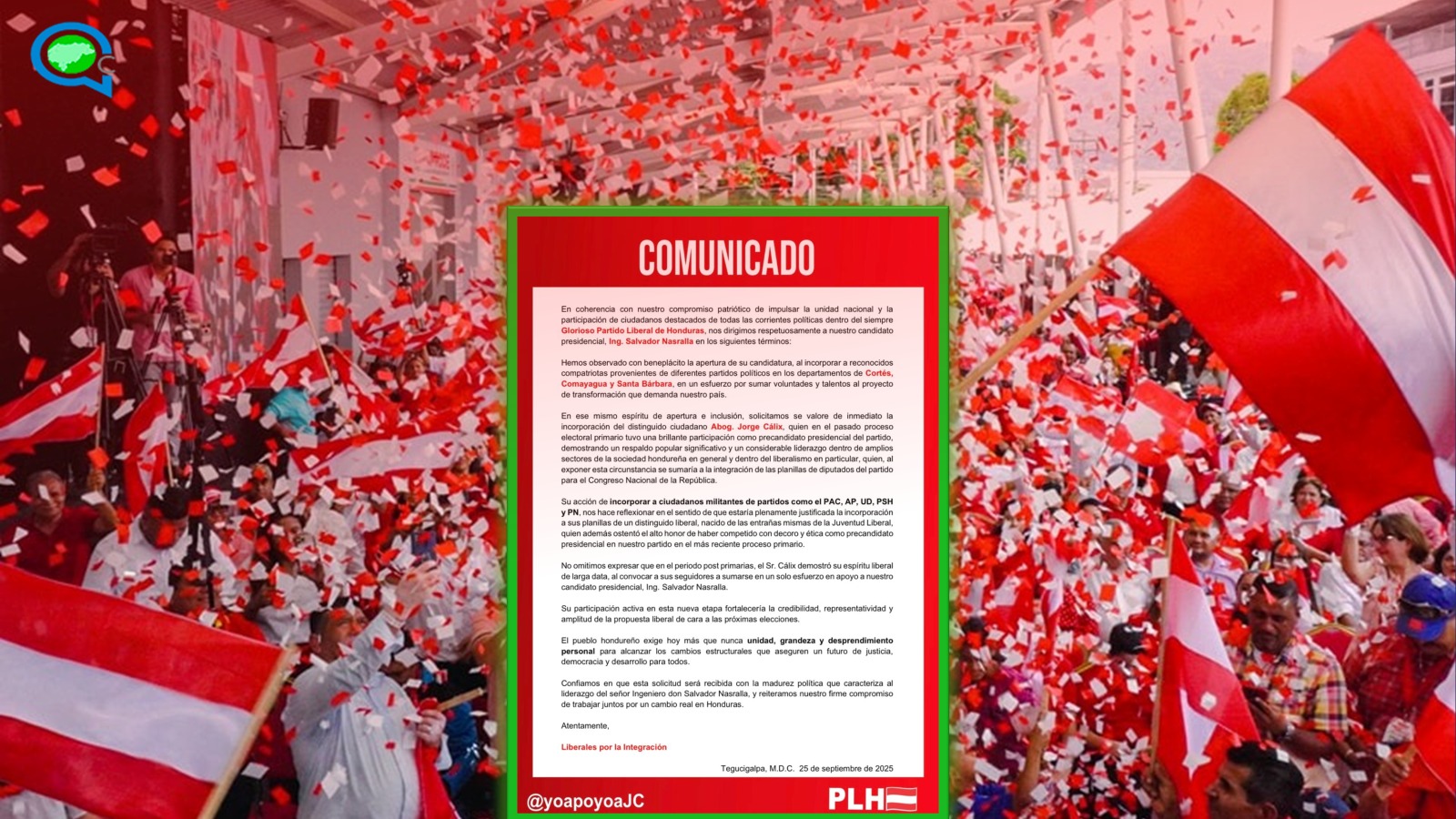 En un comunicado dirigido al candidato presidencial del Partido Liberal de Honduras (PLH), Ingeniero Salvador Nasralla, el grupo Liberales por la Integración expresó su respaldo a la apertura política y solicitó la incorporación del abogado Jorge Cálix a las planillas de diputados al Congreso Nacional.