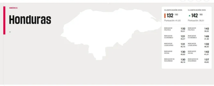 En este contexto, Honduras se ubica en la posición 132 de 180 países, con una puntuación de 41.02. Aunque el país avanzó diez puestos respecto a 2025 —cuando ocupaba el lugar 142 con 38.5 puntos—, la mejora numérica no refleja un cambio real en las condiciones del ejercicio periodístico.