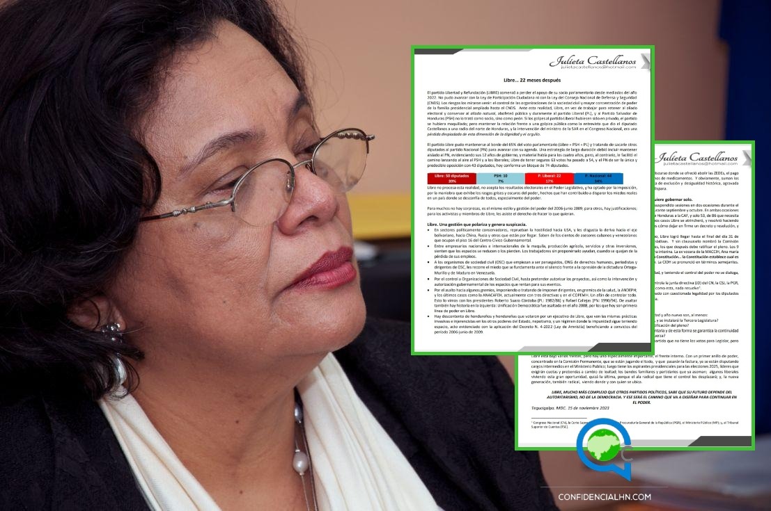 El partido Libertad y Refundación (LIBRE) comenzó a perder el apoyo de su socio parlamentario desde mediados del año 2022. No pudo avanzar con la Ley de Participación Ciudadana ni con la Ley del Consejo Nacional de Defensa y Seguridad (CNDS), exteriorizó la socióloga Julieta Castellanos a través de un nuevo escrito.
