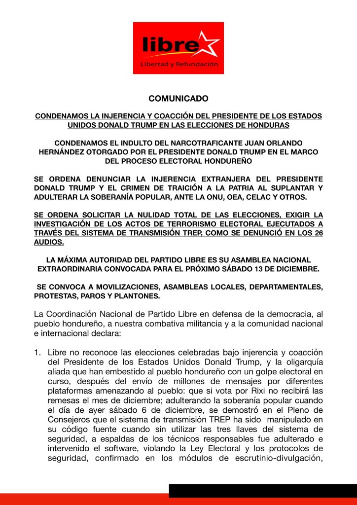 En medio de una crisis poselectoral marcada por la opacidad del sistema de transmisión de resultados y más de 72 horas sin actualizaciones oficiales, el Partido Libertad y Refundación (Libre), en comparecencia de prensa leyó este domingo un comunicado que eleva al máximo la tensión política al desconocer las elecciones, denunciar una supuesta coacción del presidente estadounidense Donald Trump, exigir la nulidad total del proceso electoral y convocar a su militancia a “movilizaciones, protestas, paros y plantones”.