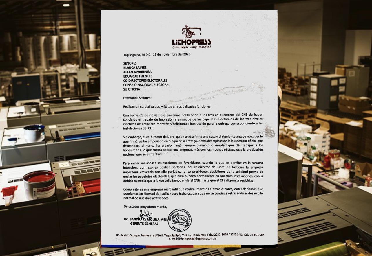 En una carta fechada el 12 de noviembre y dirigida a los codirectores Blanca Laínez, Allan Alvarenga y Eduardo Fuentes, la gerente general de LITHOPRESS, Sandra Molina Mejía, confirmó que el 5 de noviembre la empresa concluyó la impresión y empaque de las papeletas presidenciales, legislativas y municipales, y que solo estaban a la espera de la autorización formal para trasladarlas a las instalaciones del Consejo Local Electoral (CLE).