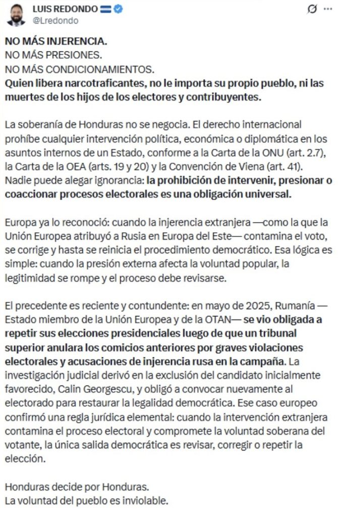 A través de su cuenta en X, Redondo rechazó lo que calificó como presiones e injerencias externas y defendió que el destino político del país debe resolverse exclusivamente por los hondureños.
