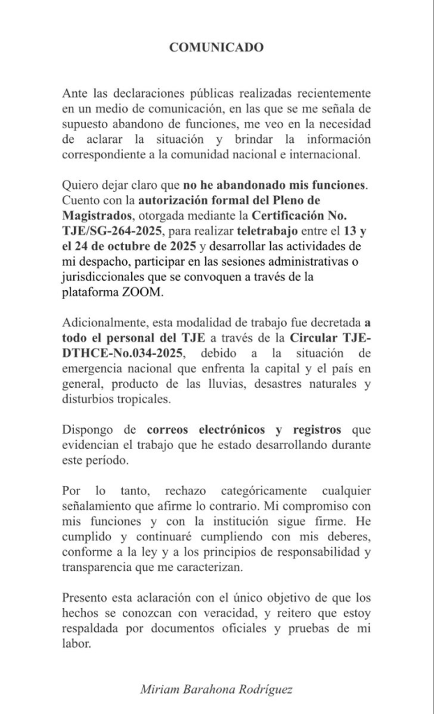 “No he abandonado mis funciones. Cuento con la autorización formal del Pleno de Magistrados, otorgada mediante la Certificación No. TJE/SG-264-2025, para realizar teletrabajo entre el 13 y el 24 de octubre de 2025”, explicó Barahona.