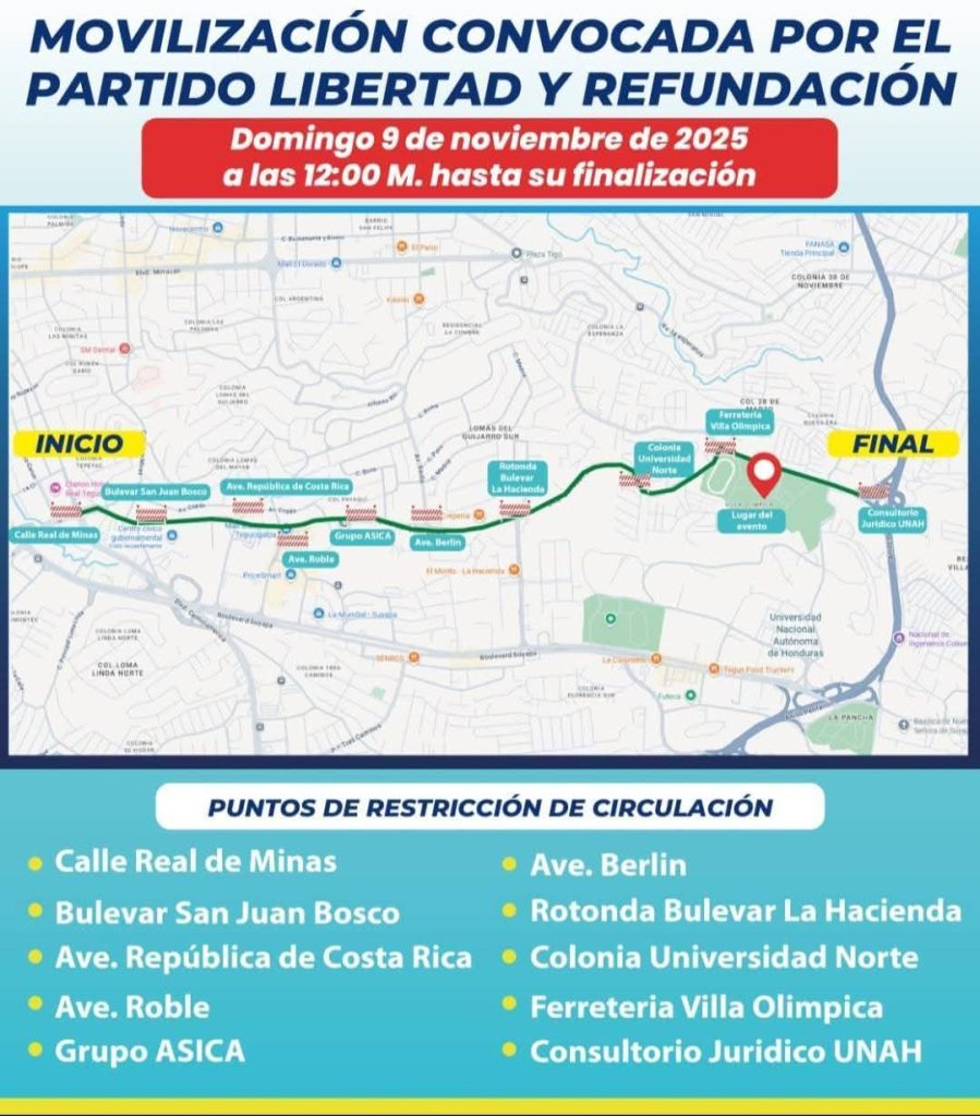 El Partido Libertad y Refundación (Libre) convocó a una marcha que iniciará a las 12:00 del mediodía y se extenderá durante la tarde, recorriendo arterias clave del oriente y centro-sur de Tegucigalpa.