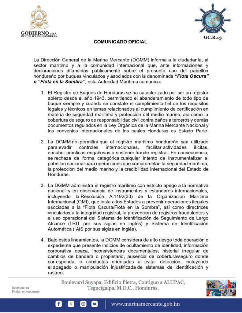 Asimismo, la institución aseguró que el registro marítimo hondureño mantiene un sistema de verificación técnica y documental riguroso, incluyendo revisión de antecedentes, trazabilidad, cumplimiento de normas de seguridad marítima y validación en plataformas internacionales especializadas.