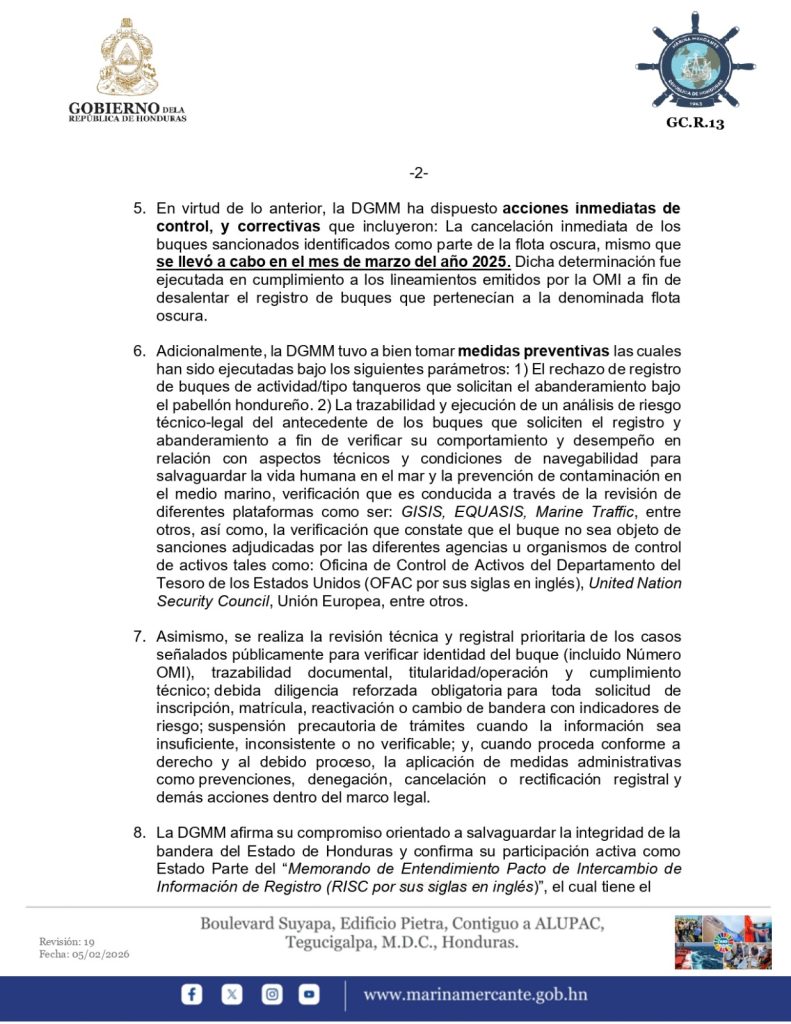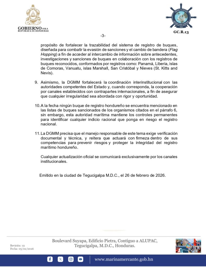 En el comunicado se enfatiza que, a la fecha, ningún buque de registro hondureño se encuentra mencionado en listas de sanción de los organismos citados, aunque se mantienen controles permanentes para identificar cualquier indicio de riesgo que pueda afectar la credibilidad internacional del país.