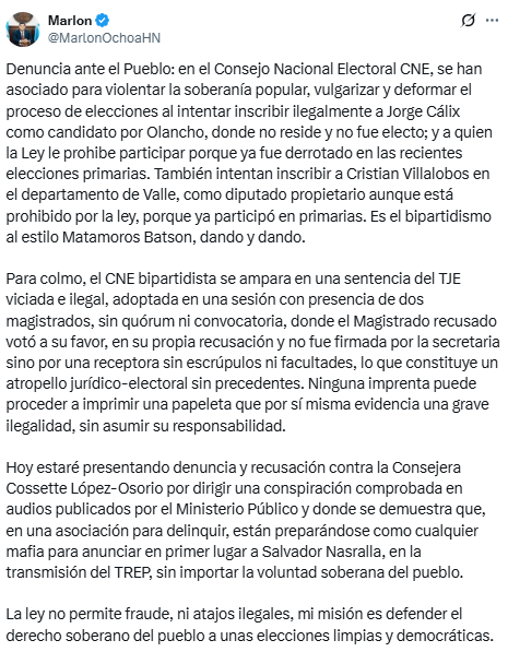 En un extenso mensaje publicado en sus redes sociales, Ochoa afirmó que dentro del CNE existe una “asociación para violentar la soberanía popular” e intentos de “inscripciones ilegales” de candidaturas, señalando directamente a los diputados Jorge Cálix y Cristian VillaloboS.