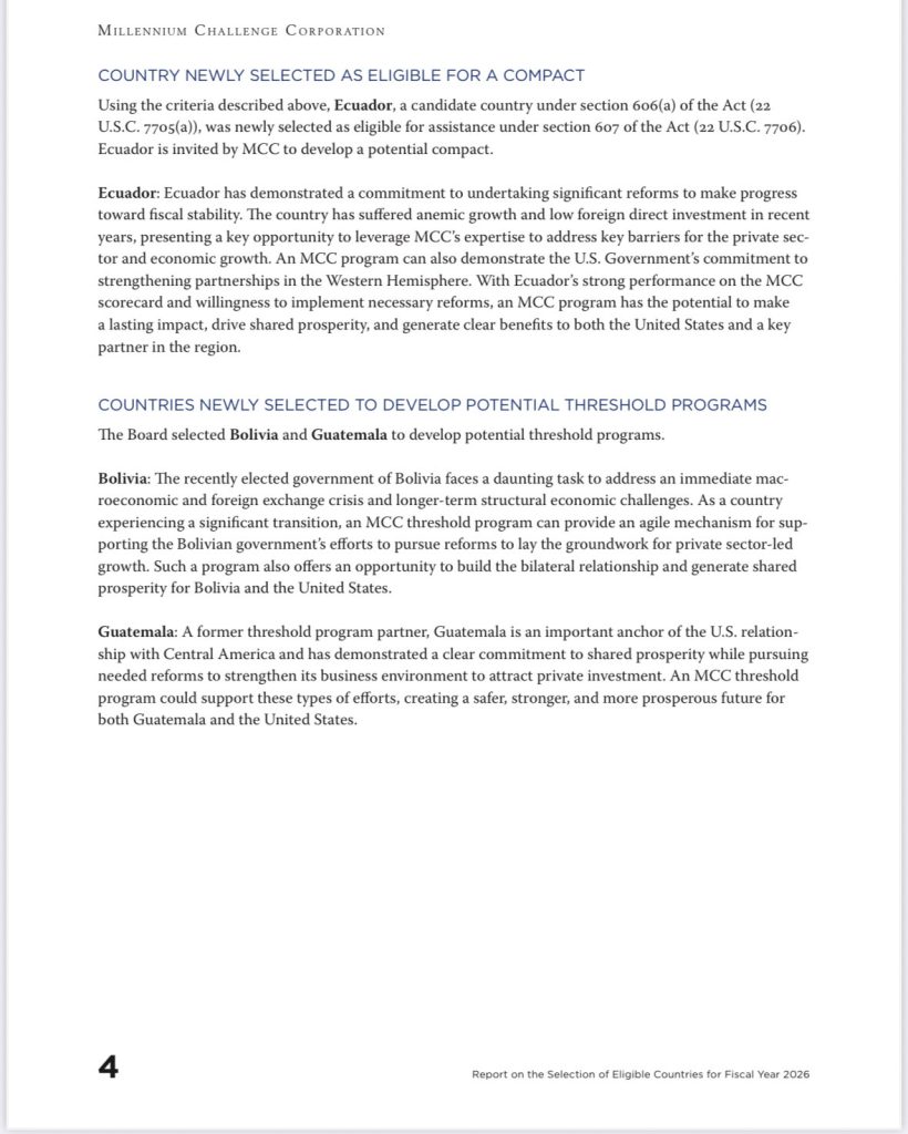 Pese a cumplir formalmente con los requisitos, la MCC optó por no seleccionar a Honduras, priorizando únicamente a Ecuador, Bolivia y Guatemala para acceder a los fondos de cooperación.