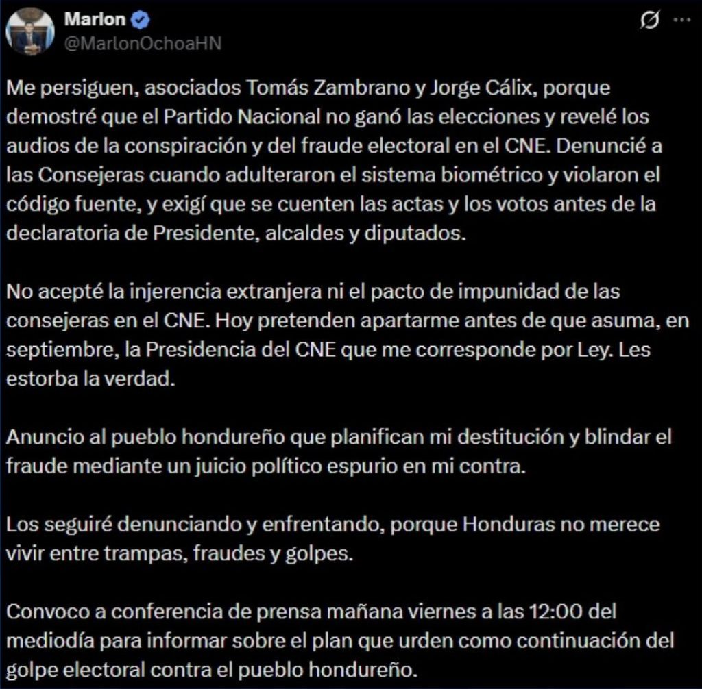En ese contexto, Ochoa convocó a una conferencia de prensa para este viernes a las 12:00 del mediodía, en la que promete revelar detalles sobre el supuesto plan que —según él— constituye la continuación de un “golpe electoral” contra el pueblo hondureño.