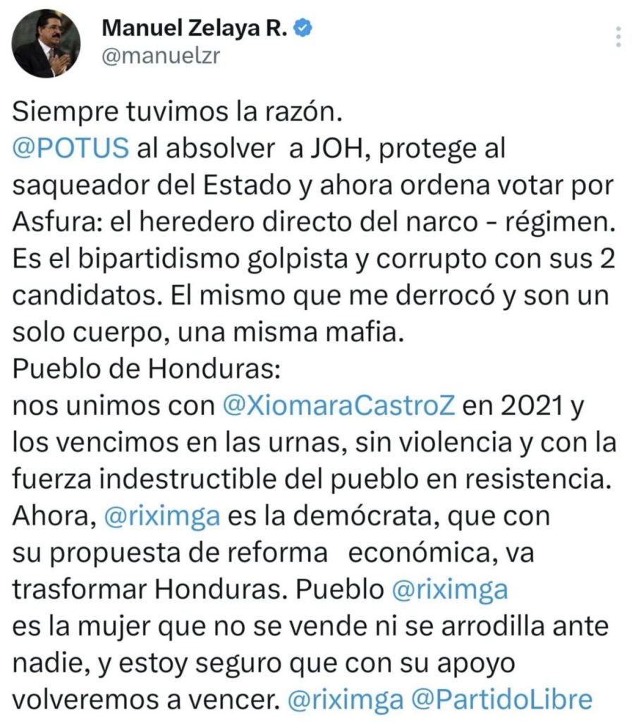 Zelaya calificó el pronunciamiento de Trump como un intento de “absolver al saqueador del Estado” y de intervenir en las elecciones hondureñas al ordenar votar por Nasry “Tito” Asfura, candidato presidencial del Partido Nacional.