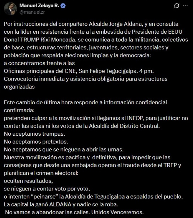 En el posteo íntegro, Zelaya indicó que la convocatoria se realiza “por instrucciones del compañero alcalde Jorge Aldana” y en consulta con la excandidata presidencial Rixi Moncada, a quien identifica como líder de la resistencia frente a lo que denominó una “embestida” del presidente de Estados Unidos, Donald Trump.