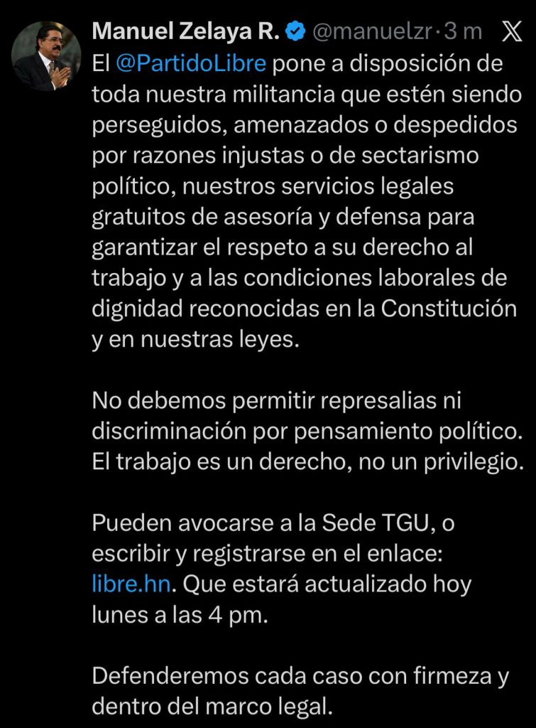 El expresidente de Honduras, Manuel Zelaya, anunció que el Partido Libertad y Refundación (Libre) pondrá a disposición de su militancia servicios legales gratuitos para quienes denuncien estar siendo “perseguidos”, “amenazados” o “despedidos” por razones que calificó como injustas o producto de sectarismo político.