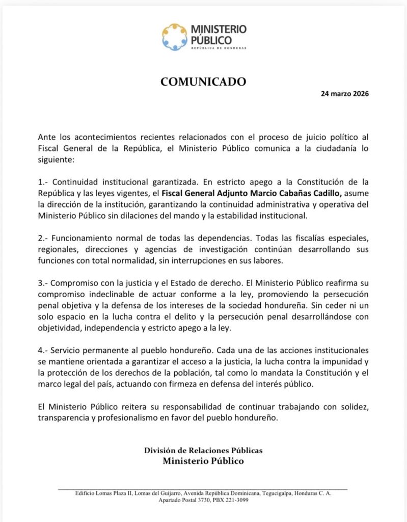 En medio del proceso de juicio político contra el fiscal general, el Ministerio Público de Honduras emitió este 24 de marzo de 2026 un comunicado oficial en el que busca transmitir un mensaje de estabilidad institucional y continuidad en sus funciones.