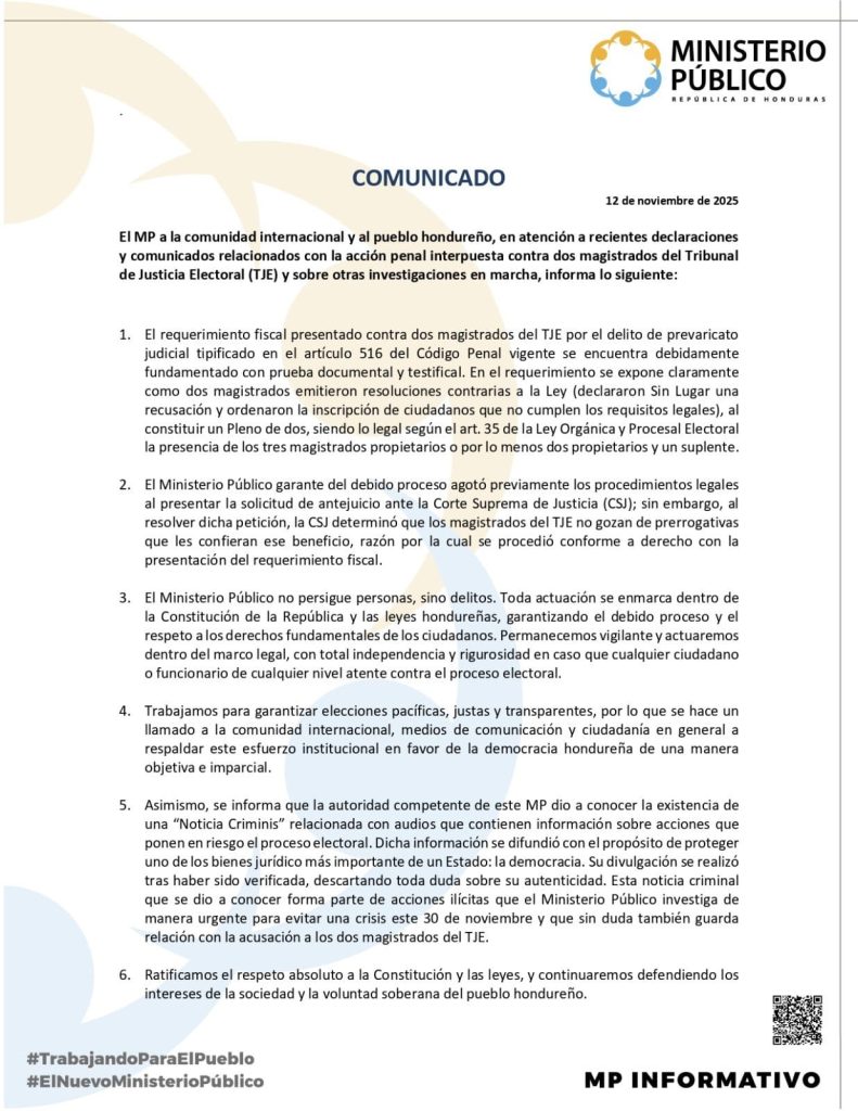 “Toda actuación se enmarca dentro de la Constitución de la República y las leyes hondureñas, garantizando el debido proceso y el respeto a los derechos fundamentales de los ciudadanos”, sostiene el comunicado, en el que el MP reafirma su independencia y rigor en cualquier investigación relacionada con el proceso electoral.