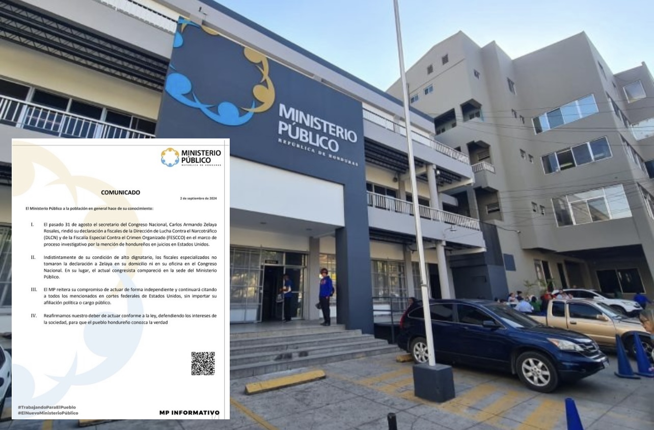 Autoridades del Ministerio Público de Honduras emitieron un comunicado este lunes respecto a la declaración de Carlos Armando Zelaya Rosales, secretario del Congreso Nacional, quien compareció ante los fiscales de la Dirección de Lucha Contra el Narcotráfico (DLCN) y de la Fiscalía Especial Contra el Crimen Organizado (FESCCO) el pasado sábado 31 de agosto.