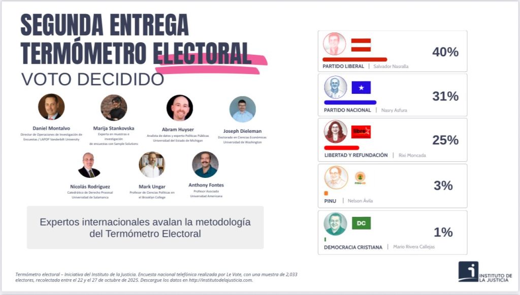 A un mes de las elecciones generales del 30 de noviembre de 2025, la segunda entrega del Termómetro Electoral del Instituto de la Justicia, en colaboración con la firma internacional Le Vote, vuelve a colocar a Salvador Nasralla como el candidato con mayor intención de voto a nivel nacional.