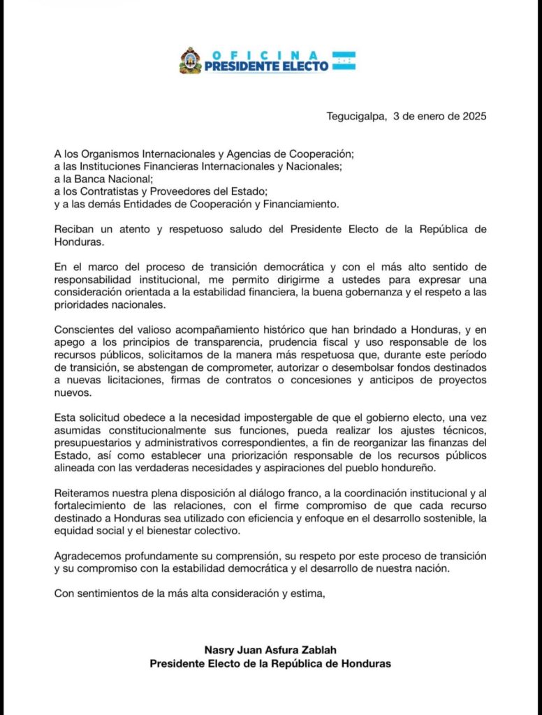 Mediante un comunicado difundido en sus redes sociales, Asfura Zablah hizo un llamado directo a organismos internacionales, agencias de cooperación, instituciones financieras nacionales e internacionales, banca nacional, así como a contratistas y proveedores del Estado, para que se abstengan de autorizar o desembolsar fondos destinados a nuevas licitaciones, contratos, concesiones o anticipos de proyectos.