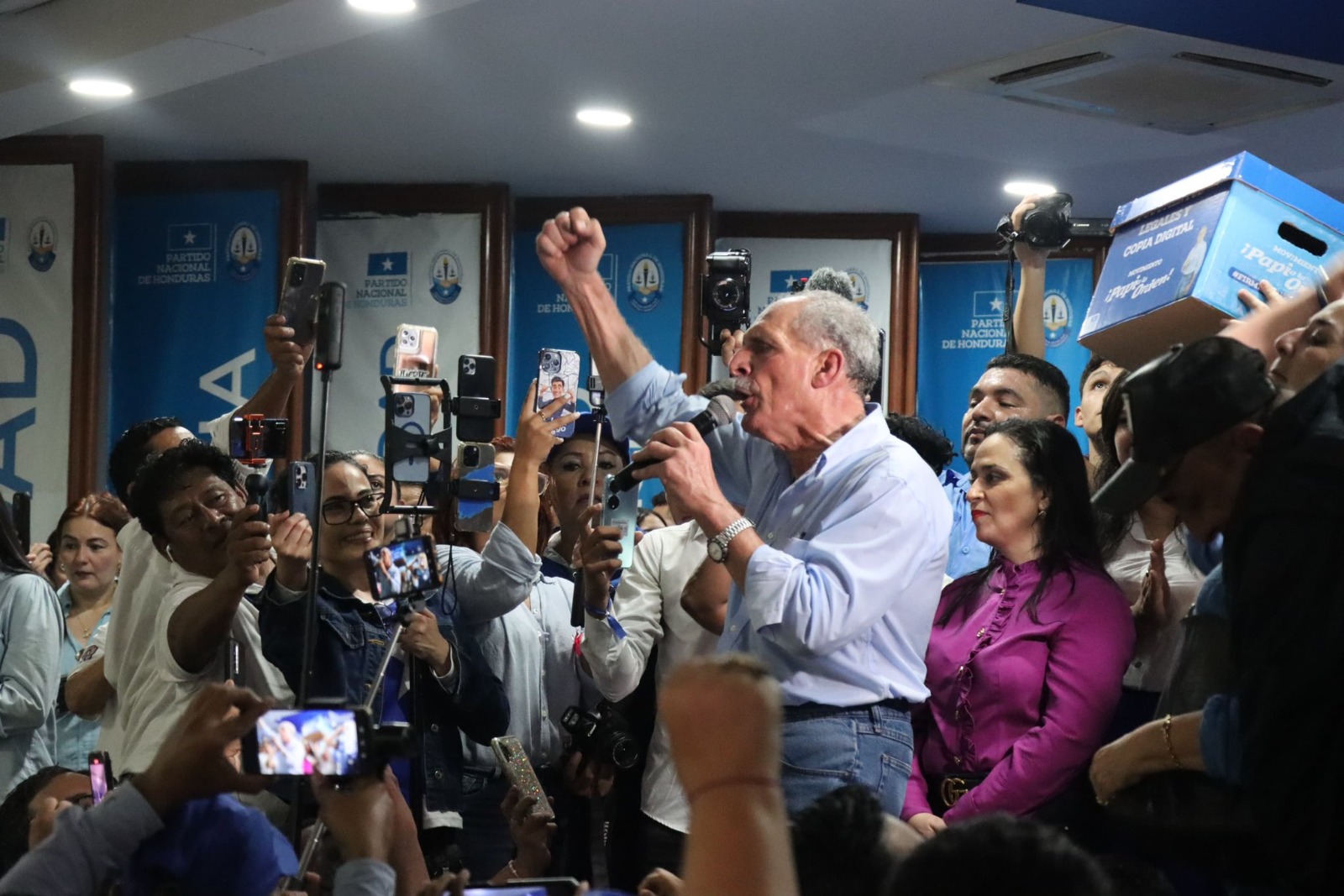 “Papi a la Orden” como es popularmente conocido, llegó acompañado de una considerable cantidad de simpatizantes a la sede del Comité Central del Partido Nacional en la ciudad de Comayagüela.