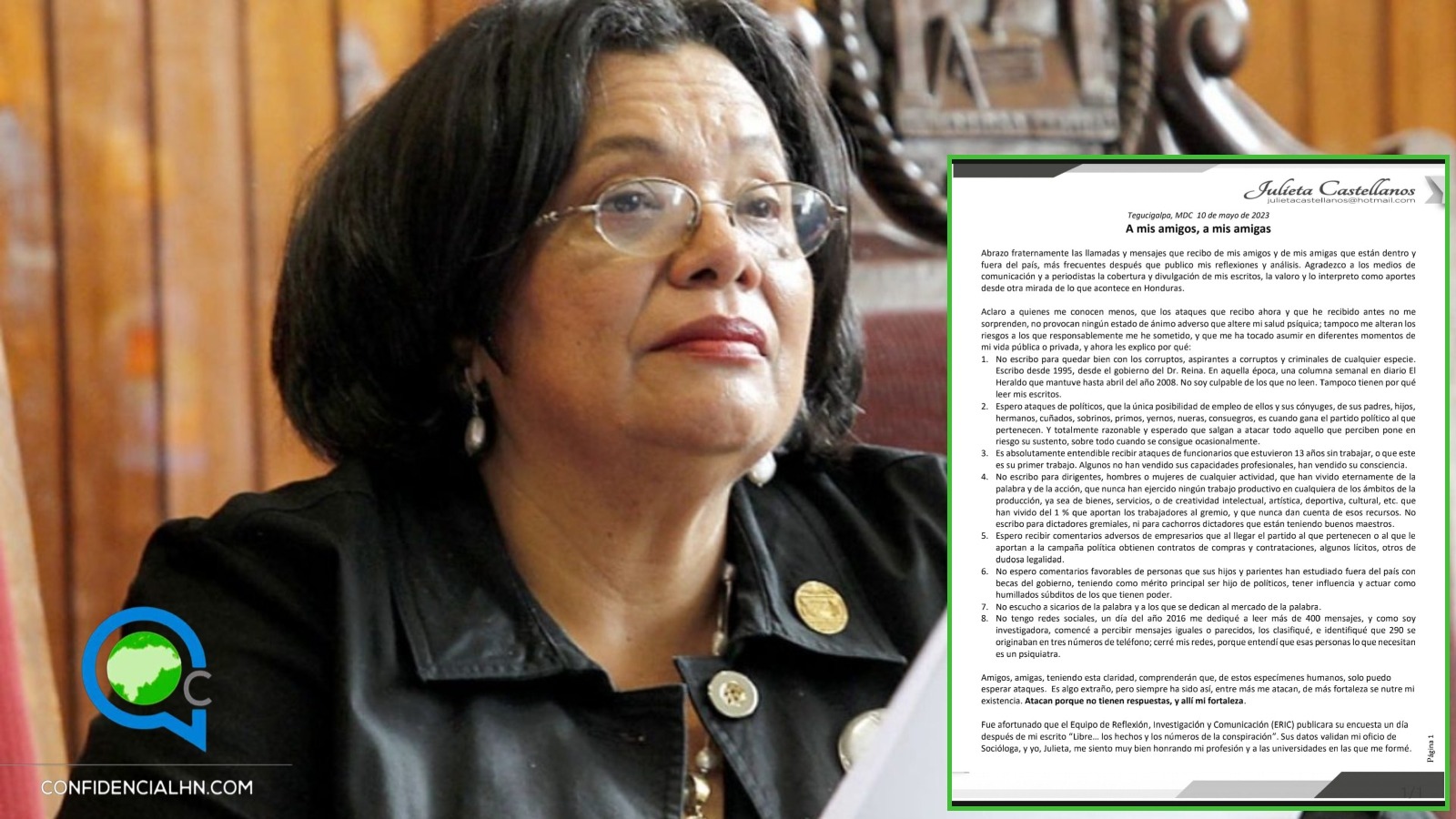 La exrectora de la Universidad Nacional Autónoma de Honduras (UNAH), Julieta Castellanos, emitió este miércoles una nueva Carta Pública titulada -A mis amigos, a mis amigas- esto tras la serie de comentarios unos a favor y otros en contra, producto del documento difundido el lunes, denominado: “Libre… los hechos y los números de la conspiración”.