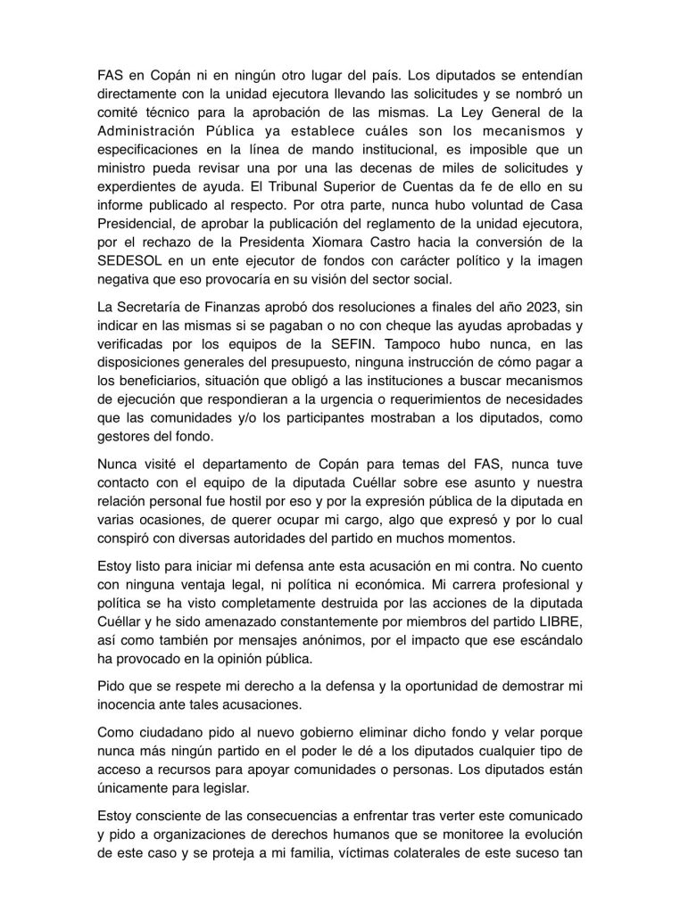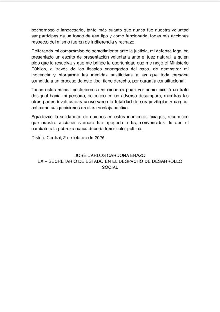 “Como ciudadano, pido que se elimine este fondo y que nunca más se permita a diputados manejar recursos públicos. Los diputados están para legislar, no para ejecutar fondos”, concluye el exministro en su comunicado fechado el 2 de febrero de 2026, en el Distrito Central.